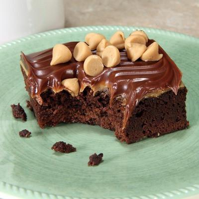 A brownie topped with a layer of White Buttercream icing, Peanut Butter and our Chocolate Fudge icing, then finally sprinkled with peanut butter chips.