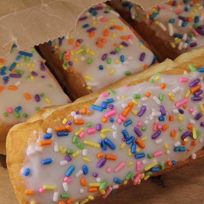 Great for the kids, or the little kid in all of us. A simple white long john with vanilla icing, topped with fun and colorful sprinkles.